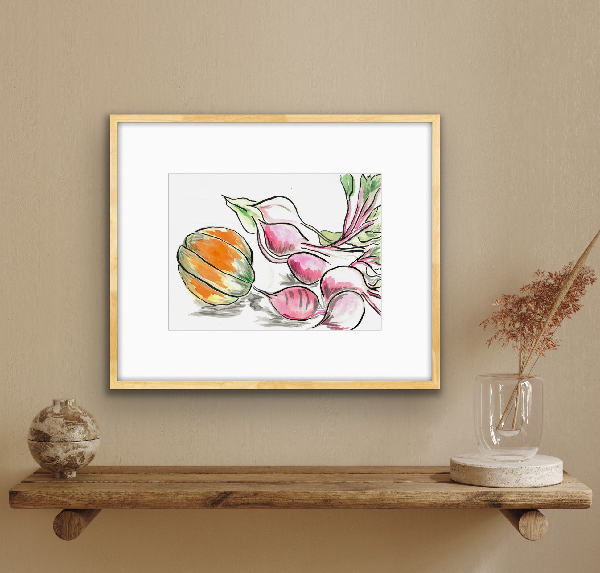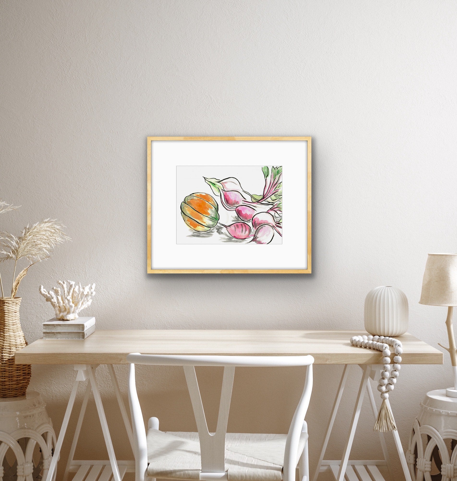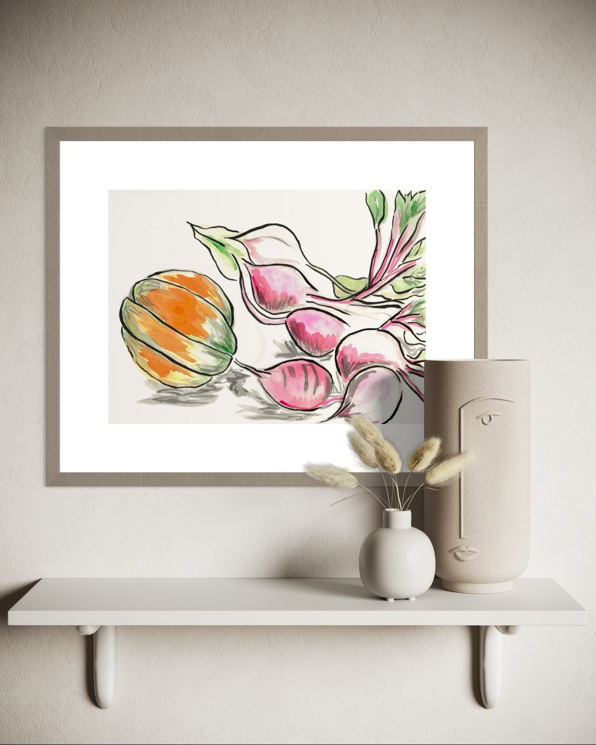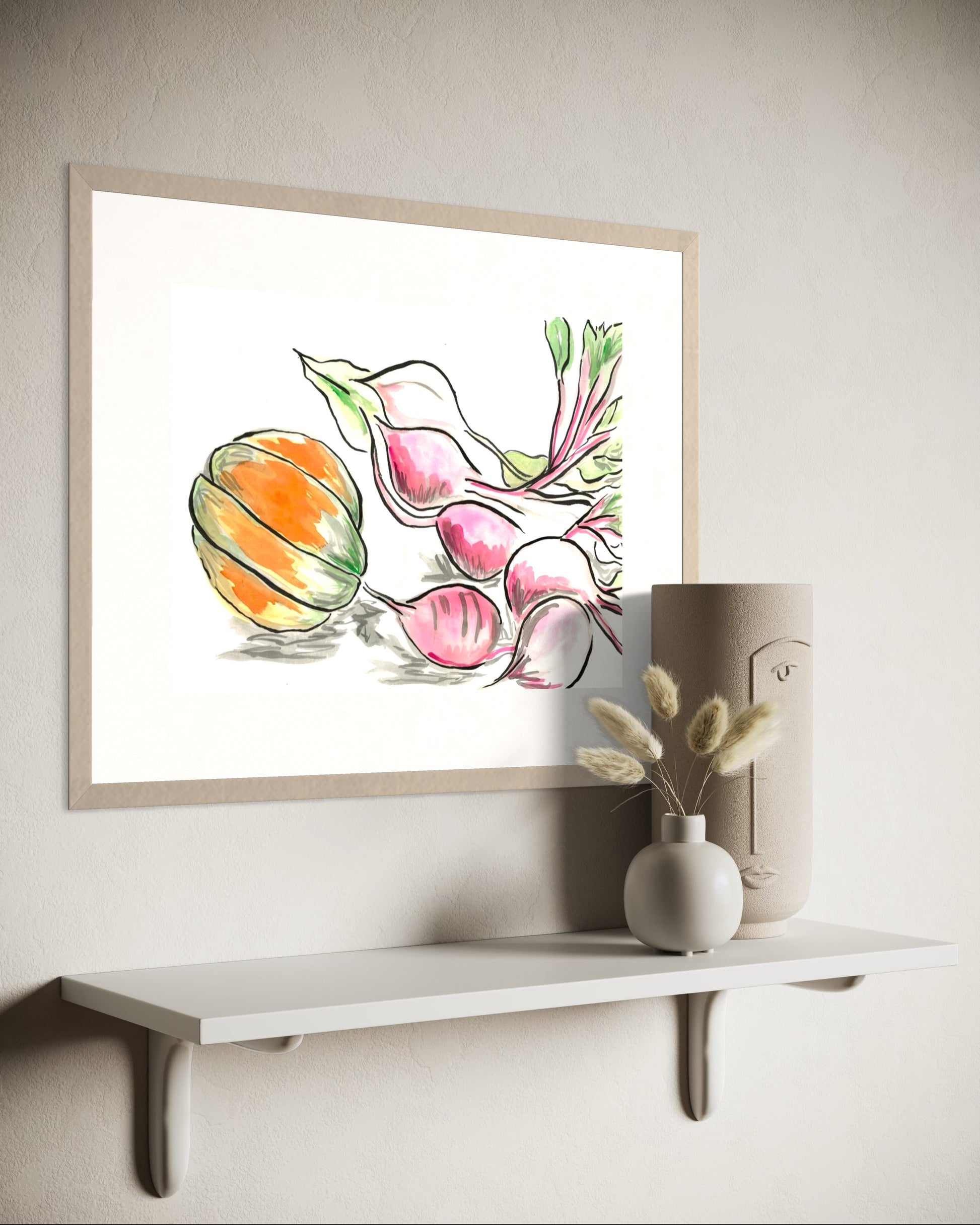 Beetroot and Pumpkin is a heartfelt celebration of the joy found in simple, everyday moments. Inspired by the experience of growing and harvesting our own butternut pumpkin, this artwork captures the warmth and beauty of homegrown produce. The delicate hues of the pumpkin and rich tones of the beets create a sense of coziness, bringing a peaceful, homely atmosphere to any space.