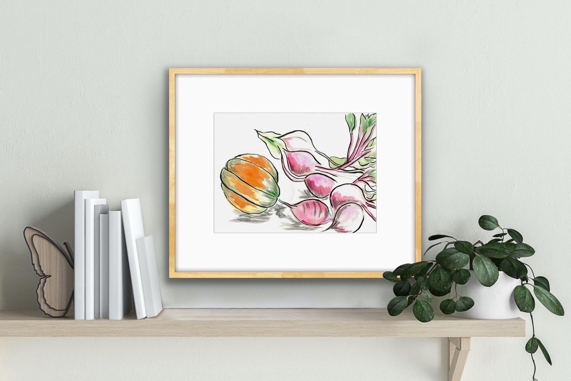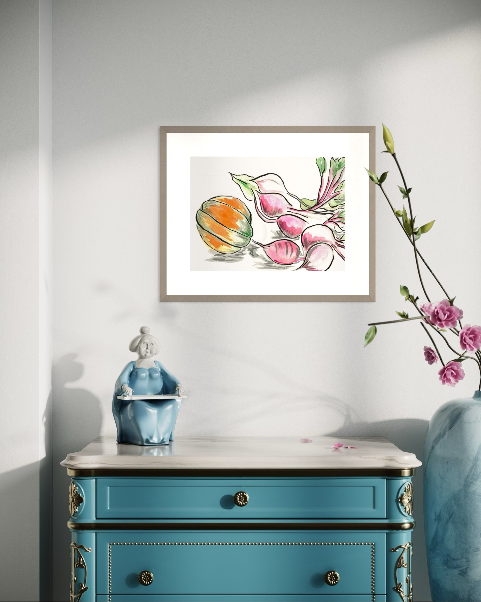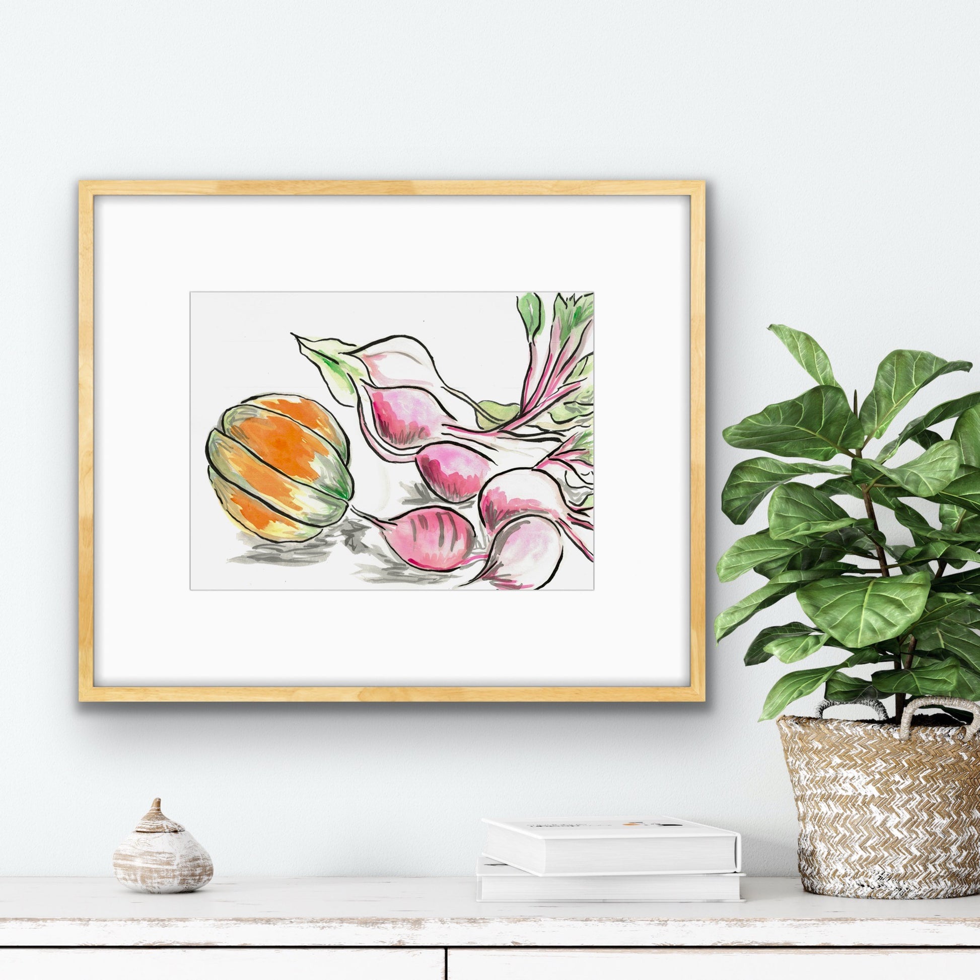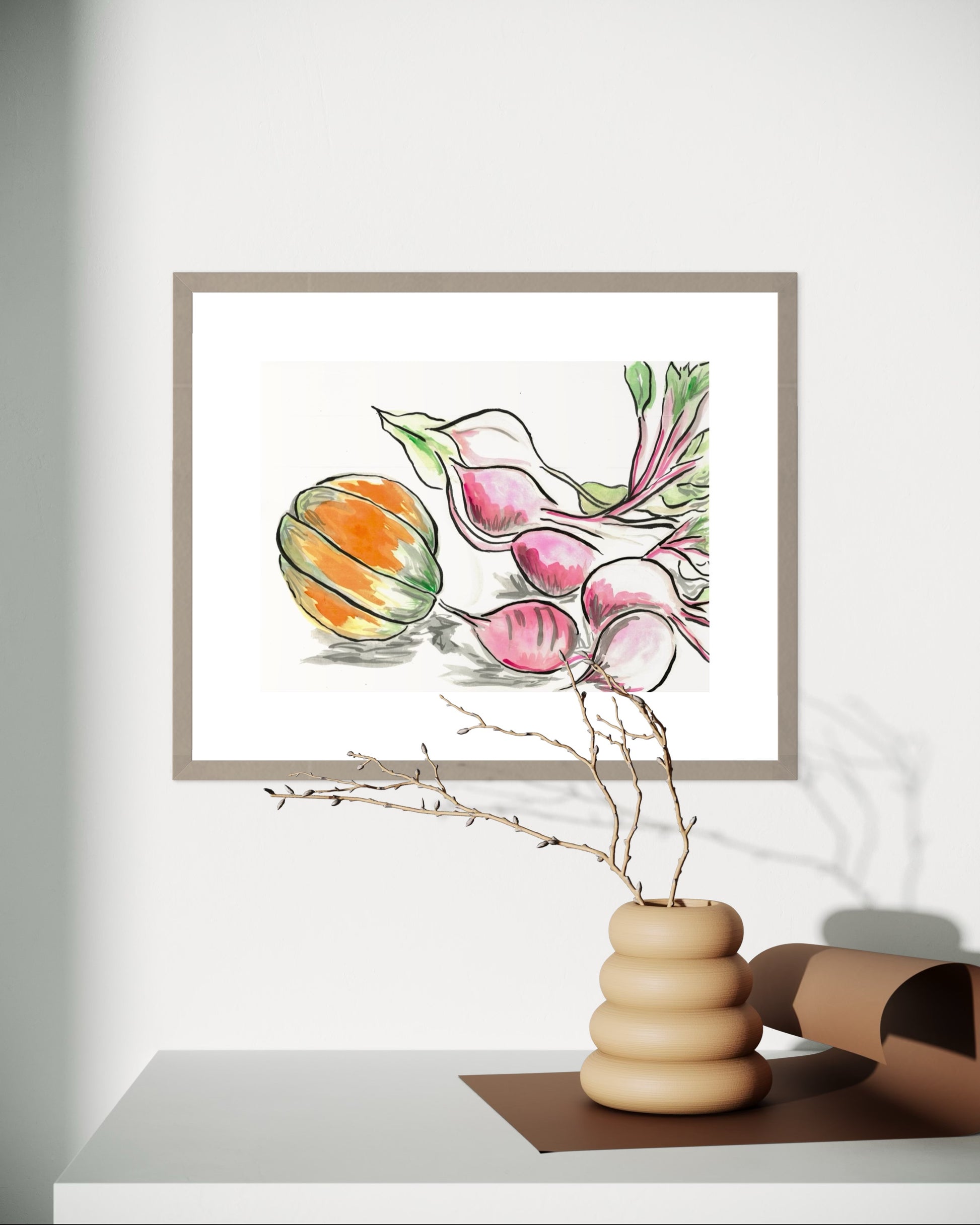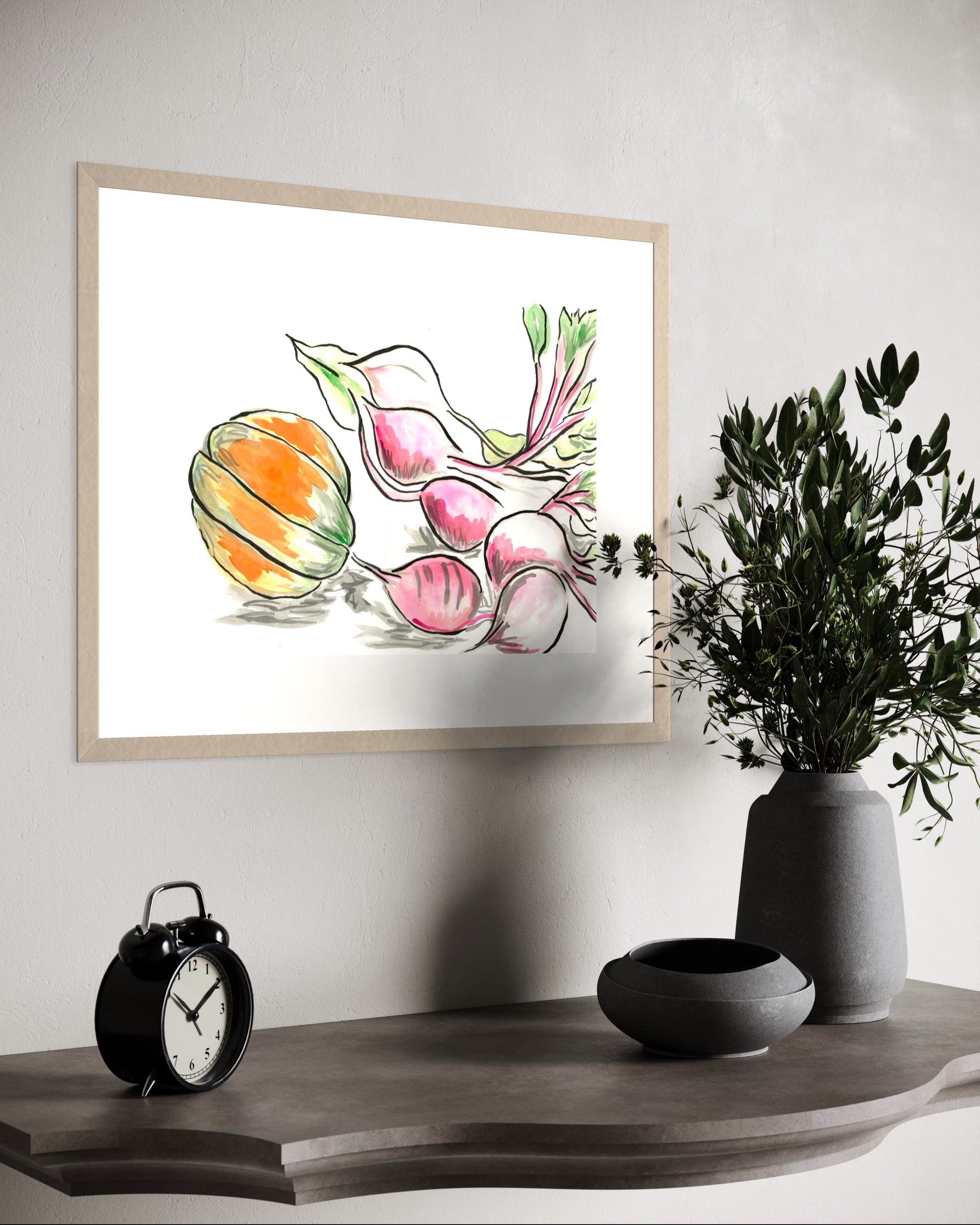 Beetroot and Pumpkin is a heartfelt celebration of the joy found in simple, everyday moments. Inspired by the experience of growing and harvesting our own butternut pumpkin, this artwork captures the warmth and beauty of homegrown produce. The delicate hues of the pumpkin and rich tones of the beets create a sense of coziness, bringing a peaceful, homely atmosphere to any space.